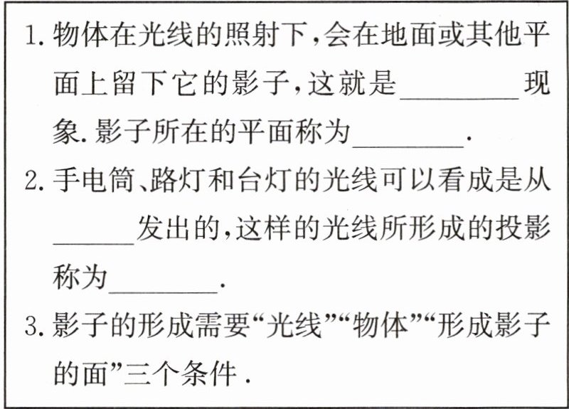 1. 物体在光线的照射下,会在地面或其他平面上留下它的影子,这就是