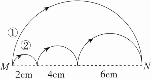 路线②由三个小半圆的弧长组成,这三个小半圆的直径分别为$2cm$、$4cm$、$6cm$。