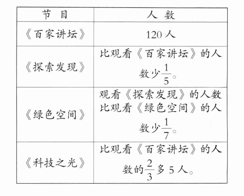 6. 学校对六年级学生观看某频道4档节目的人数统计如下表。