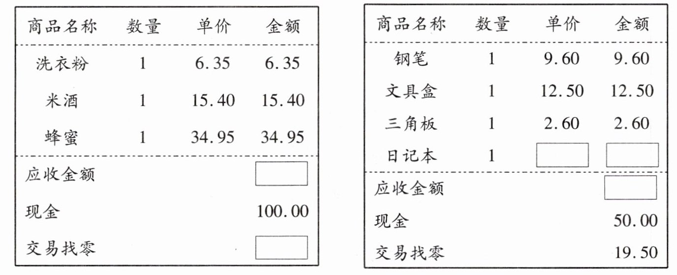 (注:因图片无法直接显示,根据常见购物小票格式,通常包含“应收金额”和“找零”等项目,此处答案推测对应填入“应收金额: