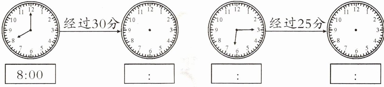 经过$25$分钟,$6$时$15$分$ + 25$分$ = 6$时$40$分,所以第二个空应填$6:15$,第三个空应填$6:40$。