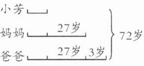 爸爸、妈妈和小芳的年龄之和是72岁,妈妈比小芳大27岁,爸爸比妈妈大3岁,小芳几岁?