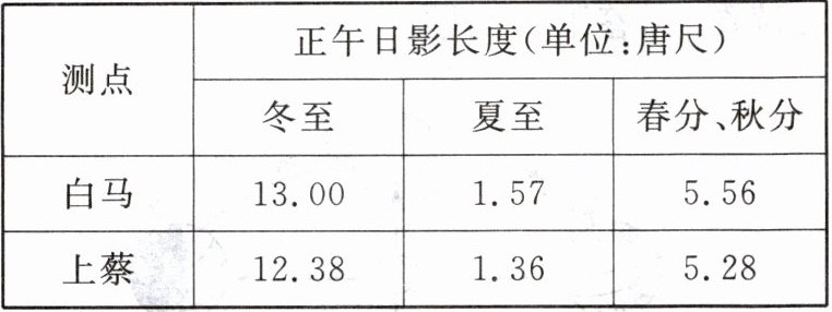 (2023·江苏南通)公元 724 年,唐代天文学家僧一行主持了一次天文大地测量,表为经度大致相等的两个测点,在二分二至日正午日影长度的测量数据。据此完成 12—13 题。