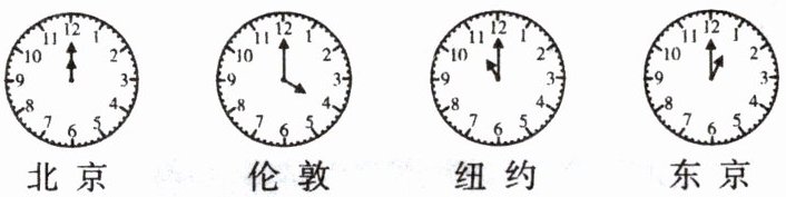 3. 小叶在北京饭店看到大堂内显示四个城市时间的时钟(如图)同一时刻时间不同,原因是(