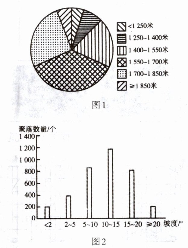 下为我国某地不同海拔乡村聚落数量百分比图(图1)和不同坡度乡村聚落数量统计图(图2)。读图,完成1—2题。