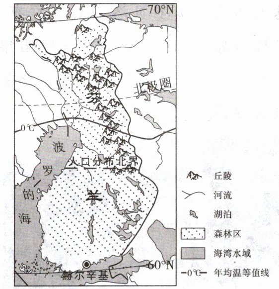芬兰(见图)位于欧洲北部,约三分之一的国土在北极圈以北,地势北高南低,北部和中部以丘陵为主,南部沿海以平原为主。芬兰的森林覆盖率高达86%,乳畜产品世界闻名。据此完成13—14题。