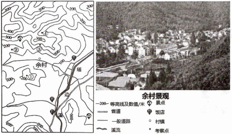为了解浙江省安吉县昔日污染严重的余村,转变为绿水青山美丽乡村的过程,某校师生开展了研学考察。下图为余村及周边等高线地形图和景观图。读图,完成5—6题。