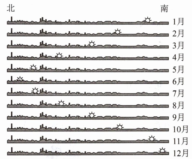 一位摄影师在北半球中纬度某地,拍摄了当地一年中每月同一天的日出方位。下图为根据该摄影师拍摄的照片绘制的日出方位变化图。据此完成 4—5 题。