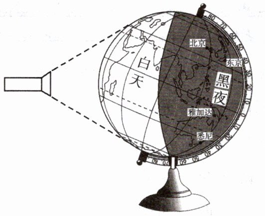 用手电筒的光线模拟太阳光照,演示地球运动及产生的地理现象。读图,完成 1—2 题。