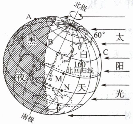 16. 读地球上的昼夜分布示意图,回答下列问题。