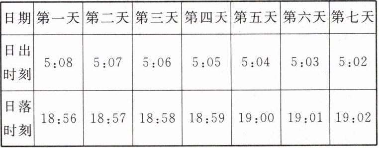 小明连续记录了烟台市七天的日出和日落时刻(下表)。结合表格资料,完成 6—7 题。