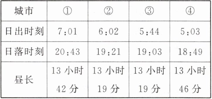 9. 小明用表格统计四城市日出和日落时刻的时候,发现截图上没有城市名称,他用序号①②③④进行了标注,并运用地球运动原理对各城市数据进行了比较(见下表),以下判断正确的是(
