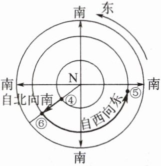 ;同理,⑤点位于④点的东南方向。当然,无论用什么方法,必须首先明确两极地区的方向:北极地区逆时针方向是东,向心方向是北,离心方向是南;南极地区顺时针方向是东,向心方向是南,离心方向是北。