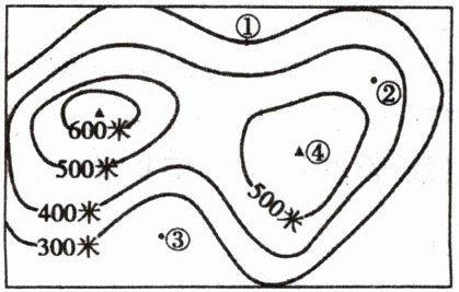 上图中①点海拔是 300 米,②点海拔介于 400 米和 500 米之间。注意图中③④两点的海拔,根据等高线图绘图原则,③点的海拔不低于
