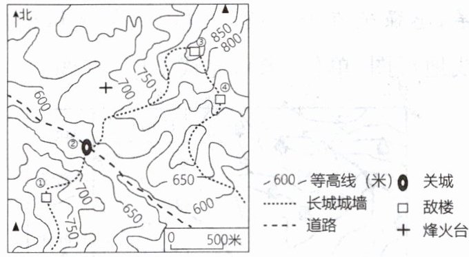 34. 北京某校地理兴趣小组利用周末时间攀登长城,并在带队老师的指导下进行野外考察活动。读长城城墙某段等高线地形图,完成下面小题。
