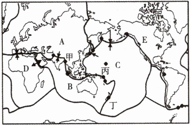 板块交界处。(4)甲、乙、丙、丁四地中处于地中海—喜马拉雅地带的是