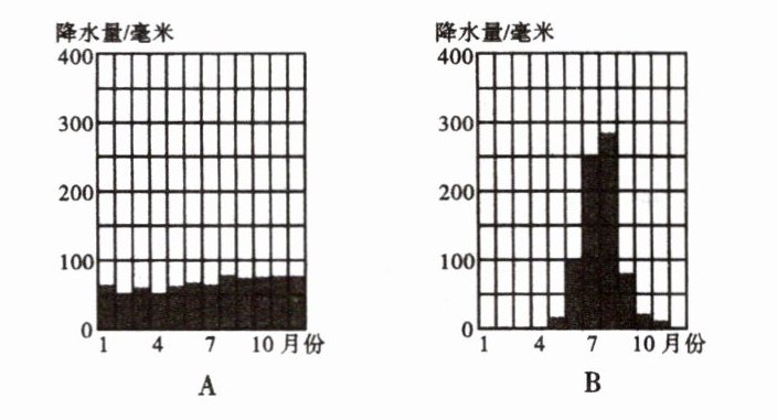 ,B 地降水量的季节差异大