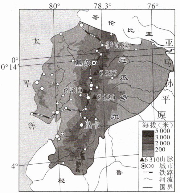 )6. 厄瓜多尔的首都基多位于赤道附近,被称为“世界春城”的影响因素是(