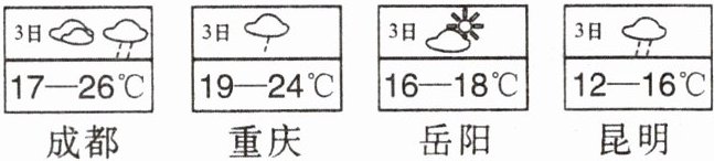 4. 下为某年 5 月 3 日四个城市的天气状况图。下列有关各地天气的描述正确的是(