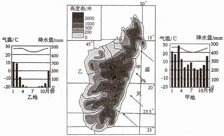 自然环境各要素之间是相互影响的。读马达加斯加岛地形图及图中甲、乙两地气候资料,完成 24—25 题。