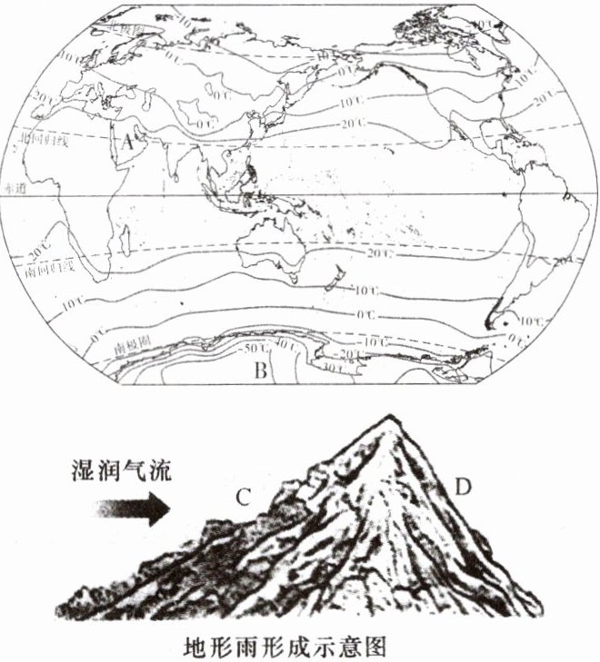 (4)地形雨形成示意图中的 C、D 两点,降水多的是