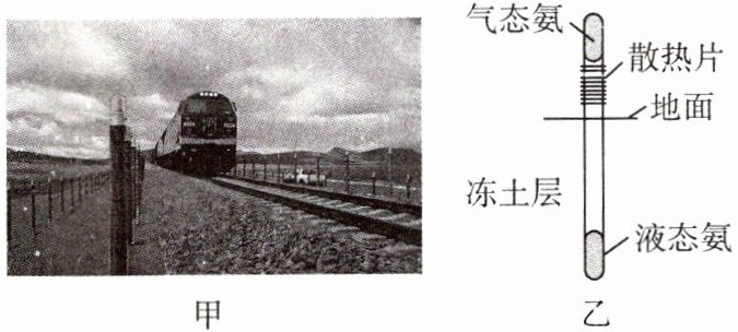 8. 我国的青藏铁路是世界上海拔最高的铁路。在冻土区的铁路两侧安装有许多热棒,如图甲所示。热棒是封闭的中空长棒,上端装有散热片,下端插在冻土中,里面填充容易汽化的液态氨作为制冷剂,如图乙所示。液态氨通过与气态氨的相互转化过程,带走冻土层热量,使冻土层保持低温不会熔化,保护路基。