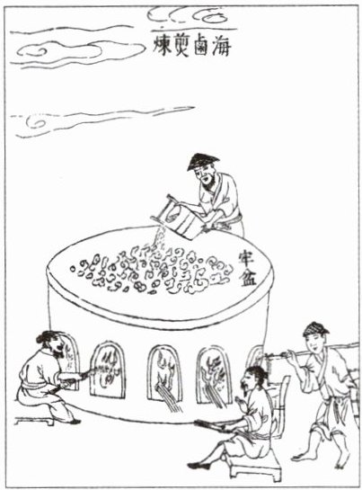 盐铁制度是古代重要的国家经济政策,如图所示,在《天工开物·作咸》中详细介绍了制盐的方法。宋代以前的海盐制造,全出于煎炼。盐的熔点是$801^{\circ}C$,沸点是$1413^{\circ}C$。海盐是刮土淋卤,取卤燃薪熬盐,煎盐场所,白雾升腾。海盐锅煎之法和用具,历经元、明、清各代更替,并无明显差异。至清光绪二十七年,盐民始采用沟滩之法,由煎盐改为晒盐,从而终结了煎盐的历史。至清末,海盐各产区普遍改用晒制之法,技术逐步完善,沿用至今仍有应用。
