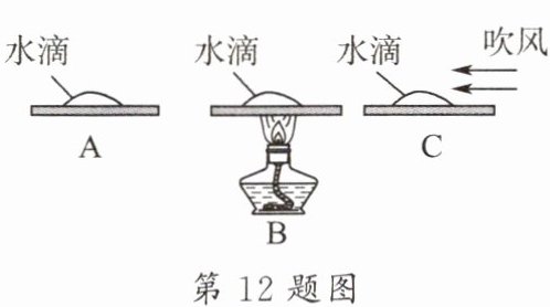 的方式来加快液体蒸发的速度。小明想探究影响水蒸发快慢的其他因素,他在三块完全相同的玻璃板上各滴一滴质量相等的水,如图所示,通过A、B两图可探究水蒸发快慢与水的温度