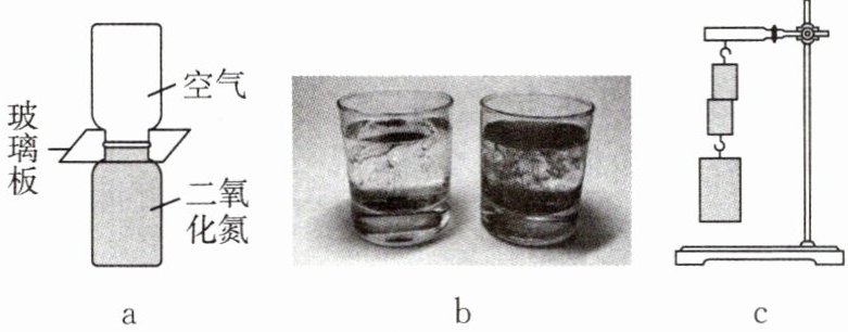 (1)装有空气和红棕色二氧化氮气体的玻璃瓶,将每组玻璃瓶口对口连接,抽去玻璃片后,两瓶气体会混合在一起,如图 a 所示。将一滴红墨水滴入清水中,红墨水逐渐散开,如图 b 所示。像这样不同的物质在互相接触时彼此进入对方的现象,叫作