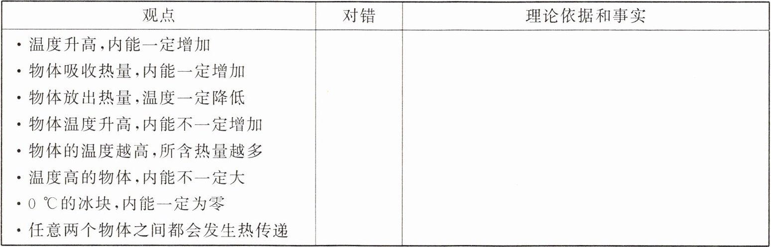 2. 下表罗列了关于温度、热量及内能的若干观点,请你对这些观点进行评估。