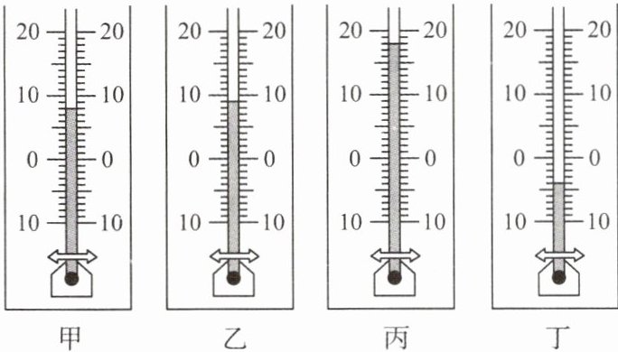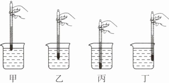 图乙。图甲温度计的玻璃泡未全部浸没在被测液体中;图丙温度计的玻璃泡接触了烧杯底部;图丁温度计的玻璃泡接触了烧杯侧壁。