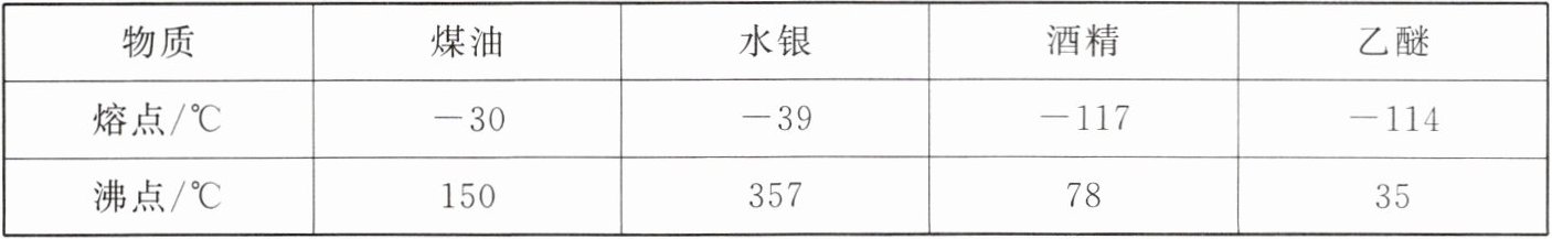 温度计测量的最高温度必须小于温度计液泡中物质的沸点,最低温度必须大于温度计液泡中物质的凝固点(熔点)。由表中数据可知,漠河的最低气温小于水银和煤油的凝固点,最高气温大于乙醚的沸点,因此应该选择酒精温度计。