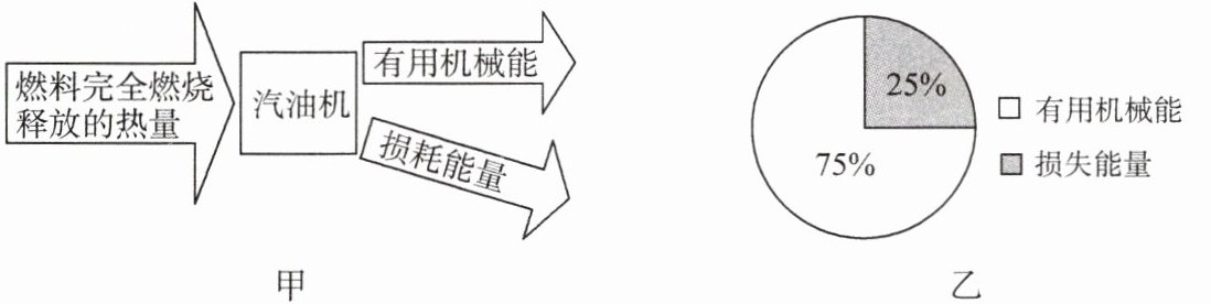 $J$(已知汽油的热值为$q_{汽油} = 4.6×10^{7}\ J/kg$)。(2)新能源电车的发动机主要把电能转化为机械能,某款新能源车的能量占比如图乙所示。若将汽油车更换成该款新能源汽车,获得同样的有用机械能完成同一段旅程,则需要消耗