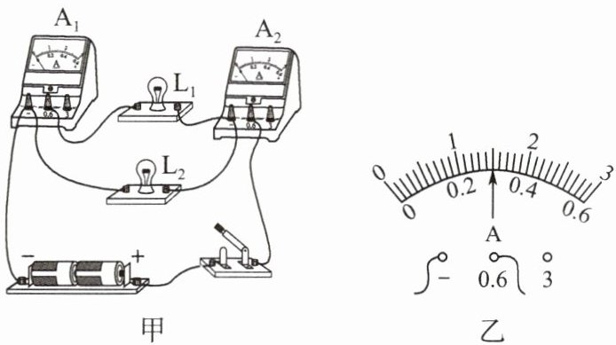 7. 如图甲所示电路,闭合开关S后,一个电流表的示数为0.5 A,另一个电流表的示数如图乙所示。画出电路图并求出流经灯$L_1$和$L_2$的电流。