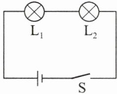 (电源、开关S、电流表A、灯泡L₁、灯泡L₂串联,电流从电源正极出发,依次经过开关S、电流表A、L₁、L₂,回到电源负极)