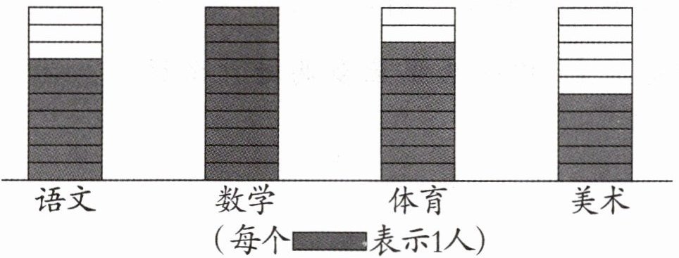 1. 数学 美术 5 2. $7 + 10 + 8 + 5 = 30$(人) 3. 14 20 16 10