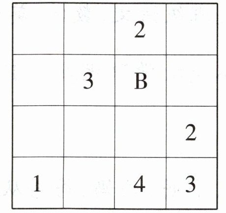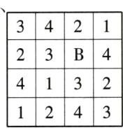 四、在下面的方格中,每行、每列都有1~4这几个数,并且每个数在每行、每列都只出现一次。B应该是几?
