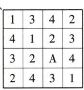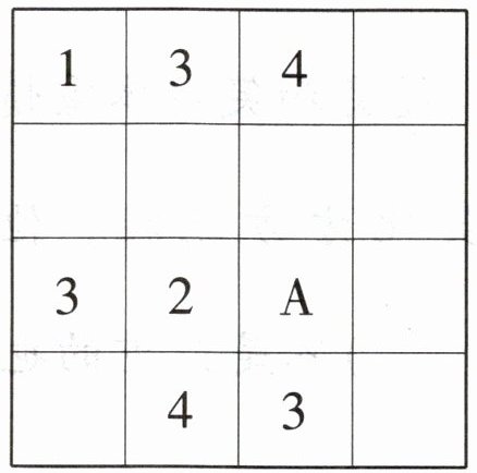 五、在下面的方格中,每行、每列都有1、2、3、4这四个数,并且每个数在每行、每列都只出现一次。A应该是几?其他方格里的数呢?填充方格。
