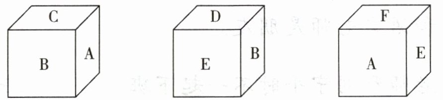 1. 一个正方体,每个面上分别写有A、B、C、D、E、F,根据下面三种不同的摆法,请你判断出这个正方体每个字母的对面是什么字母。