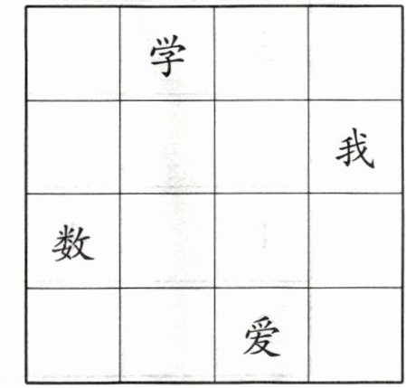 六、在下面的方格中,每行、每列都有“我、爱、数、学”这四个字,并且每个字在每行、每列中都只能出现一次,请你把空白部分补充完整。
