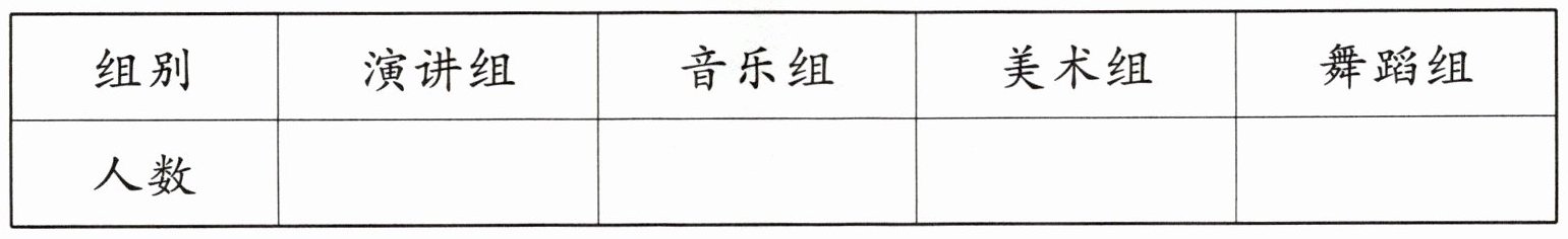 3. 美术组的人数比音乐组的人数多( )人,演讲组的人数比舞蹈组的人数少( )人。