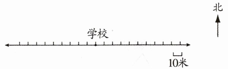 超市在学校东面50米处,即从学校向右数5段(50 ÷ 10 = 5)。