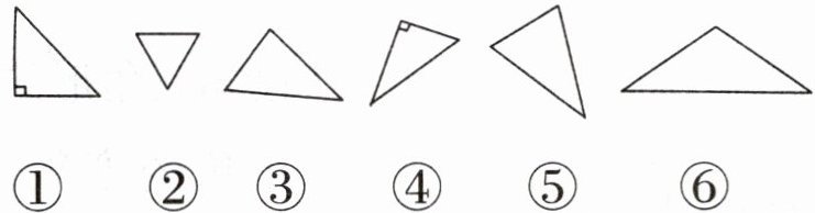 (②③⑤)是锐角三角形,(②⑤⑥)是等腰三角形,(①④)是直角三角形,(②)是等边三角形,(⑥)是钝角三角形。