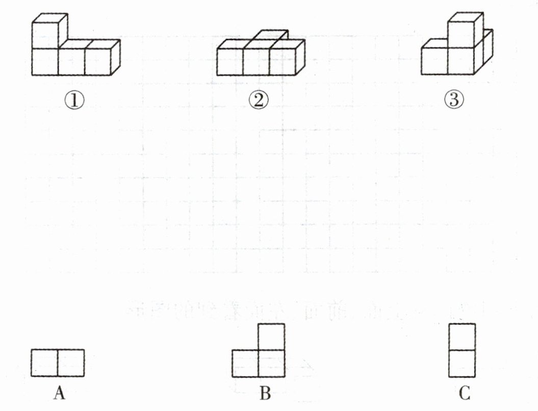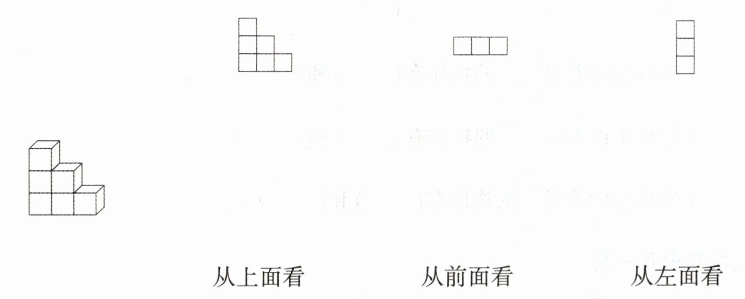 【解析】:从前面看这个立体图形,能看到3层,第一层有3个小正方形,第二层有2个小正方形(在左边和中间),第三层有1个小正方形(在最左边),对应第一个图形;从上面看,能看到1层3个小正方形并排,对应第二个图形;从左面看,能看到3层,每层各1个小正方形,对应第三个图形。