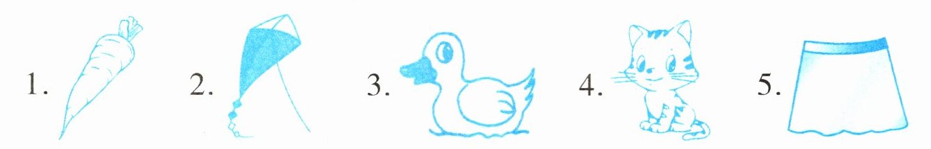1. carrot 2. kite 3. duck 4. cat 5. skirt