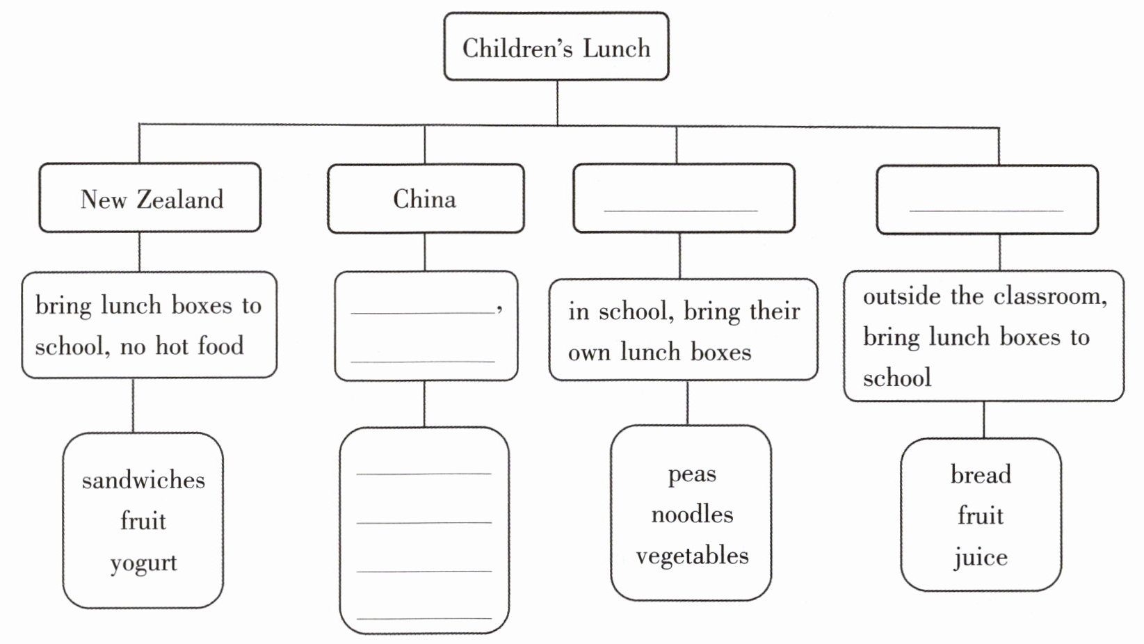 1. 第一行: England, Australia 第二行: in school, at home 第三行: rice, vegetables, pork/chicken 2. lunch, home, school, Inside/In, hot, take, bring, their
