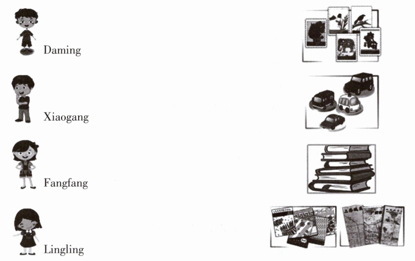 Daming-邮票;Xiaogang-玩具车;Fangfang-书籍;Lingling-地图