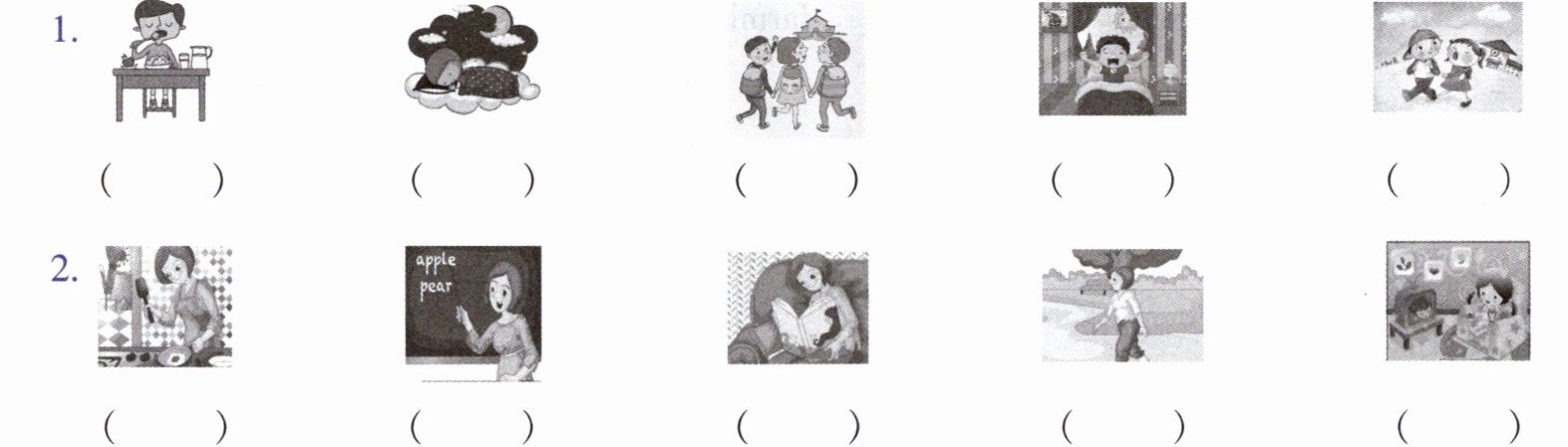 一、Listen and number. 看图,听录音,用 A,B,C……给图片标号。