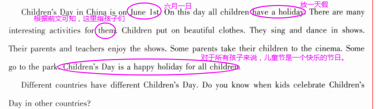 6月1日是中国的儿童节。在这一天,所有的孩子都放假。他们有很多有趣的活动。孩子们穿上漂亮的衣服。他们在表演中唱歌跳舞。他们的父母和老师喜欢这些表演。有些父母带孩子去看电影。一些人去公园。儿童节是所有孩子的快乐节日。