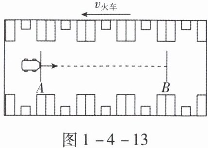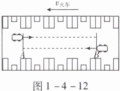 方案二:如图1-4-13所示,在车厢前后选取A、B两处,让一辆赛车做从A到B的匀速直线运动,利用电子手表的秒表功能测出赛车从A到B的运动时间;然后让该赛车以相等的速度做从B到A的匀速直线运动,测出运动时间。比较两次时间的长短。改变A、B两处距离重复上述实验两次(在实验过程中火车一直做匀速直线运动)。